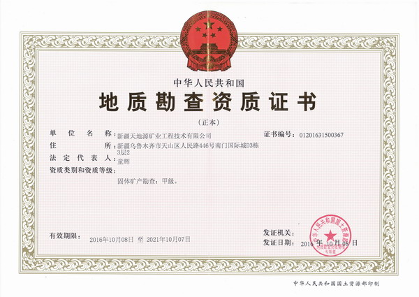 新疆天地源地勘公司成立于2004年,歷經(jīng)十余年的發(fā)展,現(xiàn)持有地質勘查甲級資質和ISO9001:2008質量管理體系認證證書。
